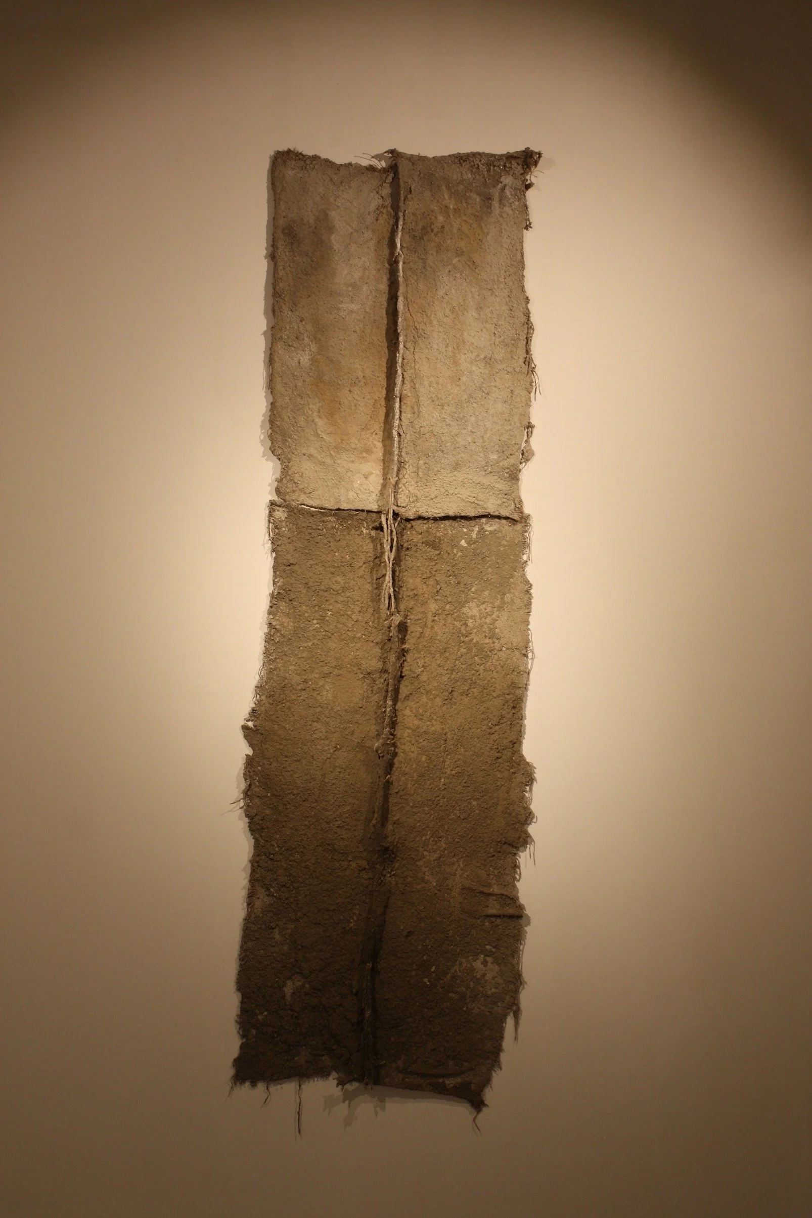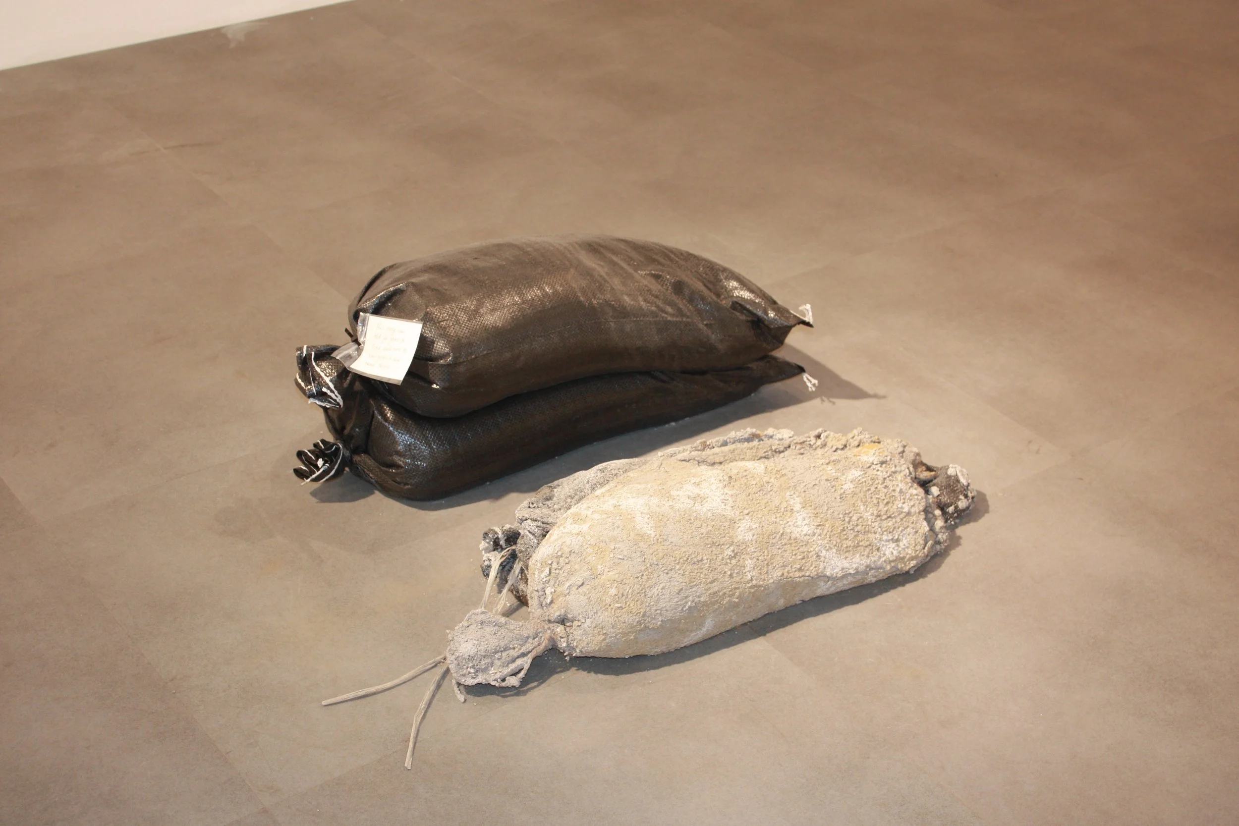 Concrete hide, she lost a part of her back as she ran; 2024; Jute Sandbag, concrete Installation; Varying sizes (about 2800mm x 600mm)