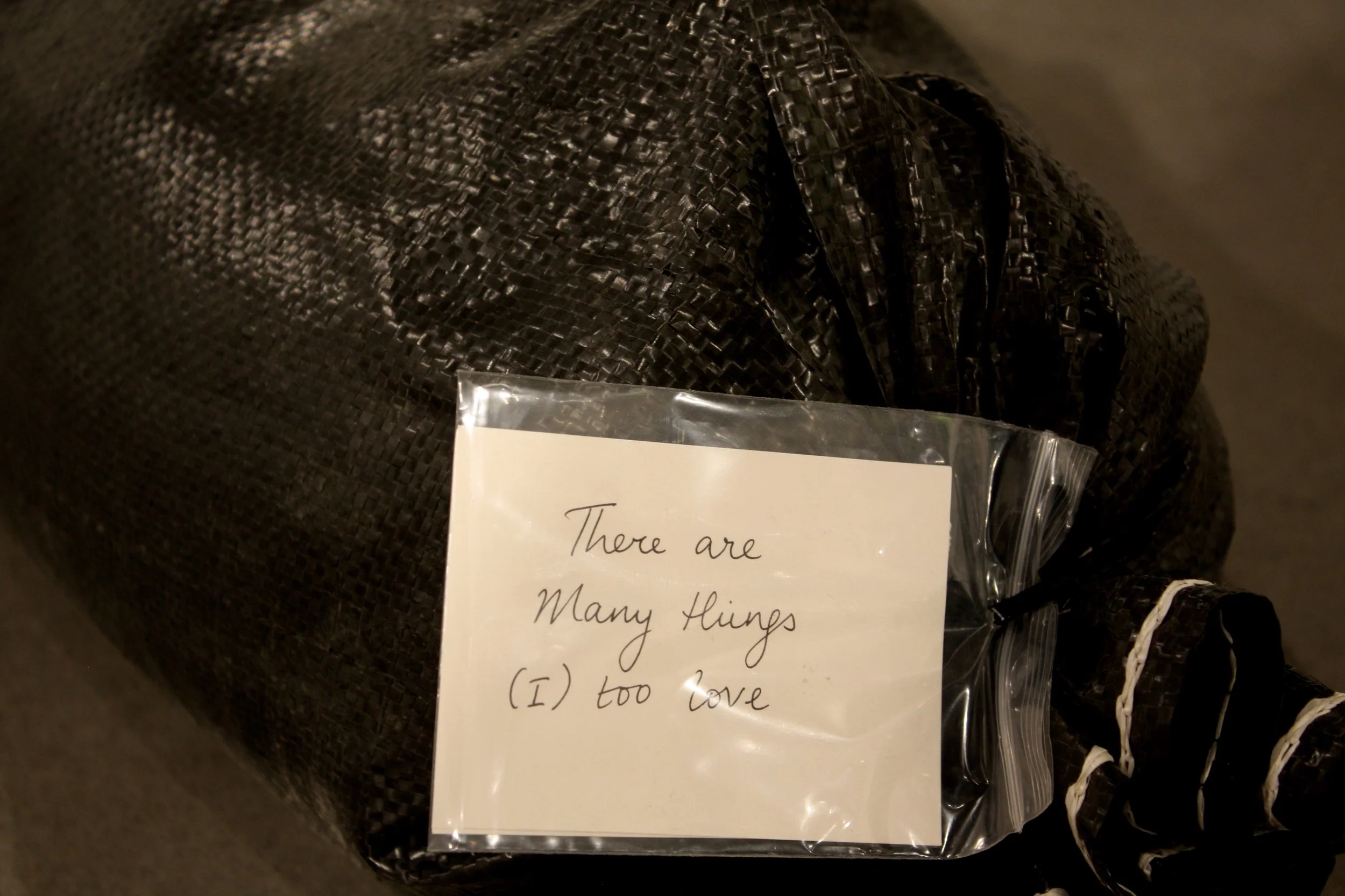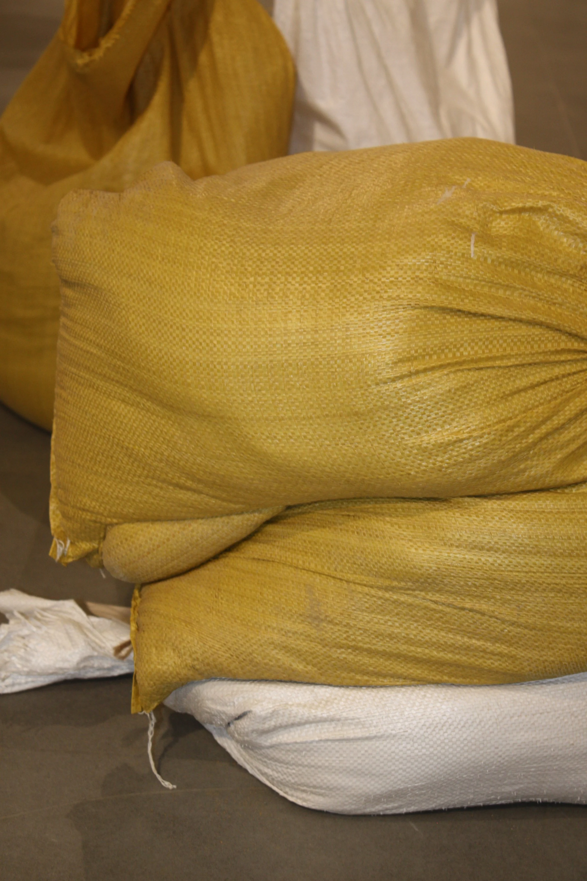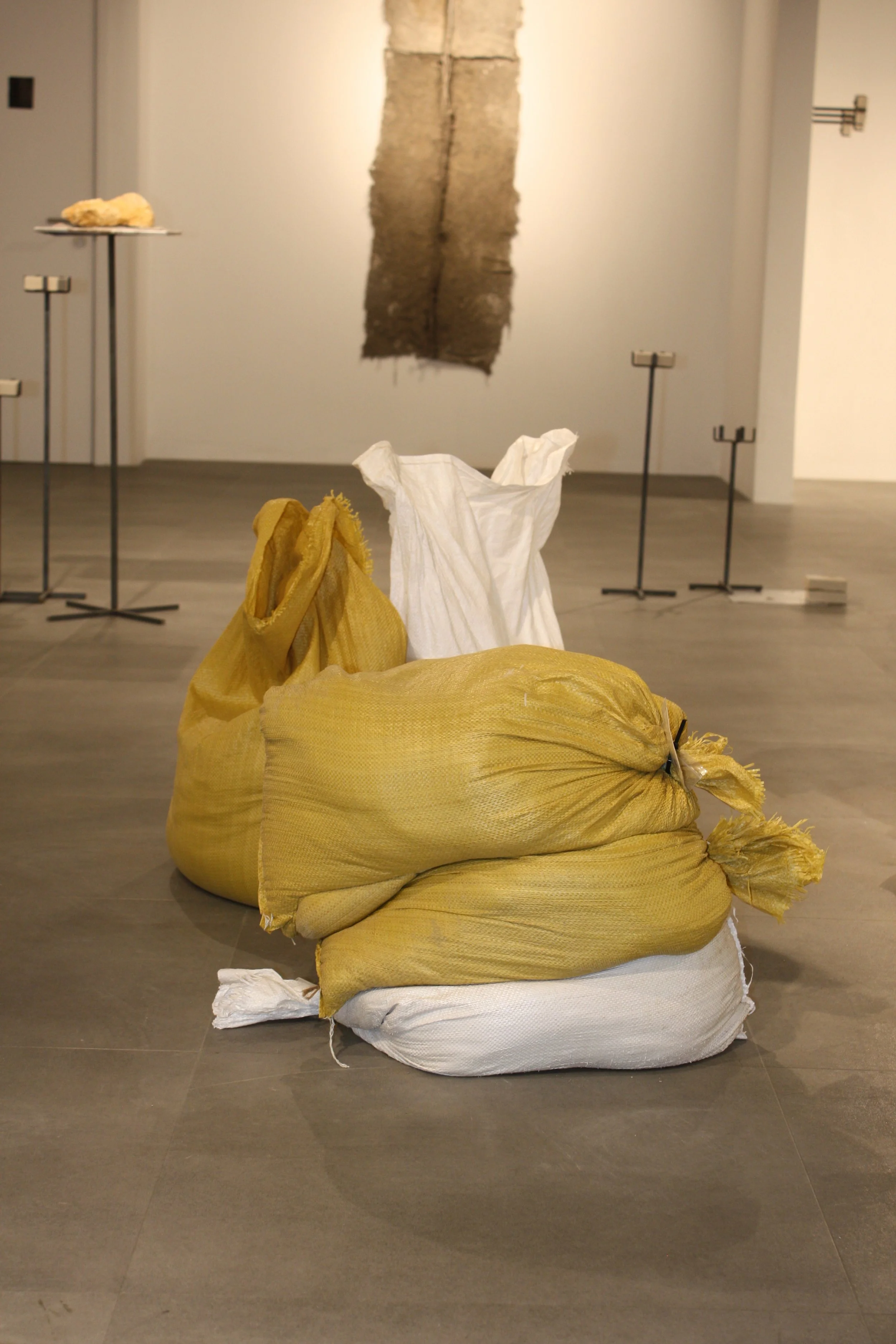 Could a vessel be held, (installation) 2024 Jute and Plactic Sandbag, concrete, red building sand, paper Installation; Varying sizes